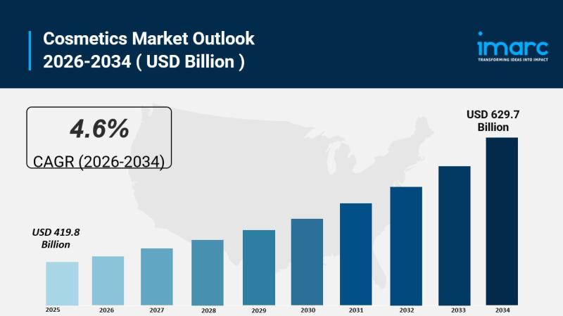 The global Cosmetics Market was valued at USD 419.8 Billion in 2025 and is forecast to reach USD 629.7 Billion by 2034, growing at a CAGR of 4.6% during 2026-2034. This growth is driven by growing emphasis on personal grooming and physical appearance, rising consumer awareness about health and sustainability, introduction of advanced product variants with natural and organic ingredients, and expanding product availability through e-commerce platforms.