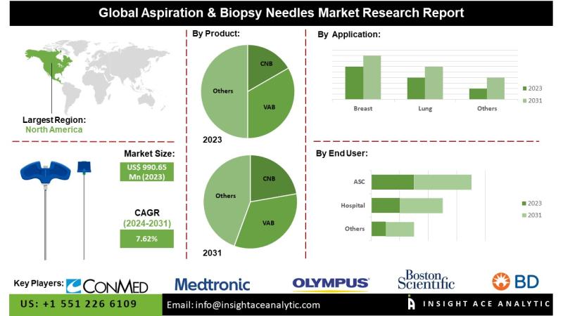 InsightAce Analytic Pvt. Ltd. announces the release of a market assessment report on the "Global Aspiration & Biopsy Needles Market- (By Product (Biopsy Needle (Core Biopsy Needles, Vacuum-Assisted Biopsy Needles), Aspiration Needle), By Application (Tumor/Cancer Application (Breast Cancer, Lung Cancer, Colorectal Cancer, Prostate Cancer, Kidney Cancer, Bone & Bone Marrow Cancer, Other Cancers), Wound Applications, Other Applications), By Procedure (Image-Guided (Ultrasound-Guided Procedures, Stereotactic Procedures, CT-Guided Procedures, MRI -Guided Procedures, Other…