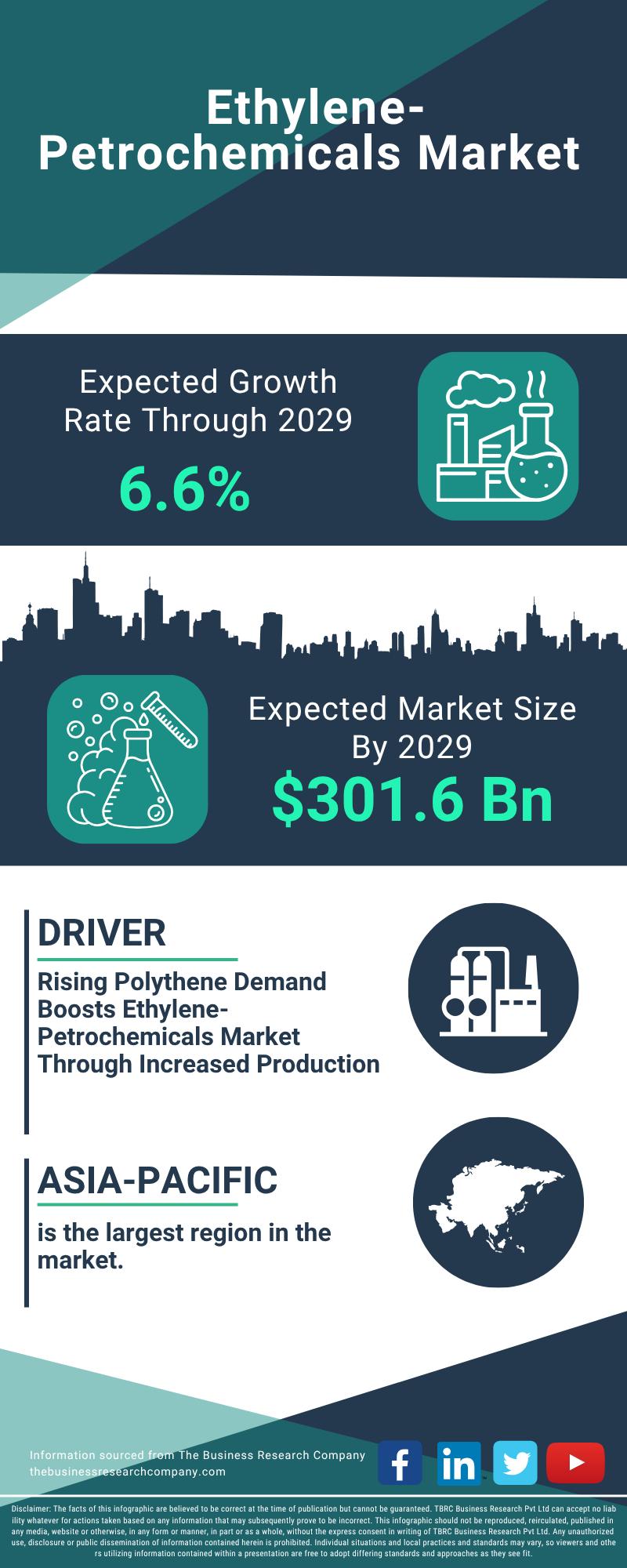 The ethylene-petrochemicals market is anticipated to reach a value of $301.6 billion by 2029, growing at a compound annual growth rate (CAGR) of 6.6%. This growth is largely propelled by factors such as rapid industrialization, increasing preference for sustainable and bio-based ethylene-petrochemicals, shifting consumer lifestyles, and rising production of finished consumer goods. Additionally, demand from sectors like automotive further supports this upward trend. Key market drivers include a shift toward renewable feedstocks, emphasis on sustainability and environmental responsibility, circular economy frameworks, bio-based ethylene, the rise of digital technologies and Industry 4.0, along with the development of green petrochemical alternatives.